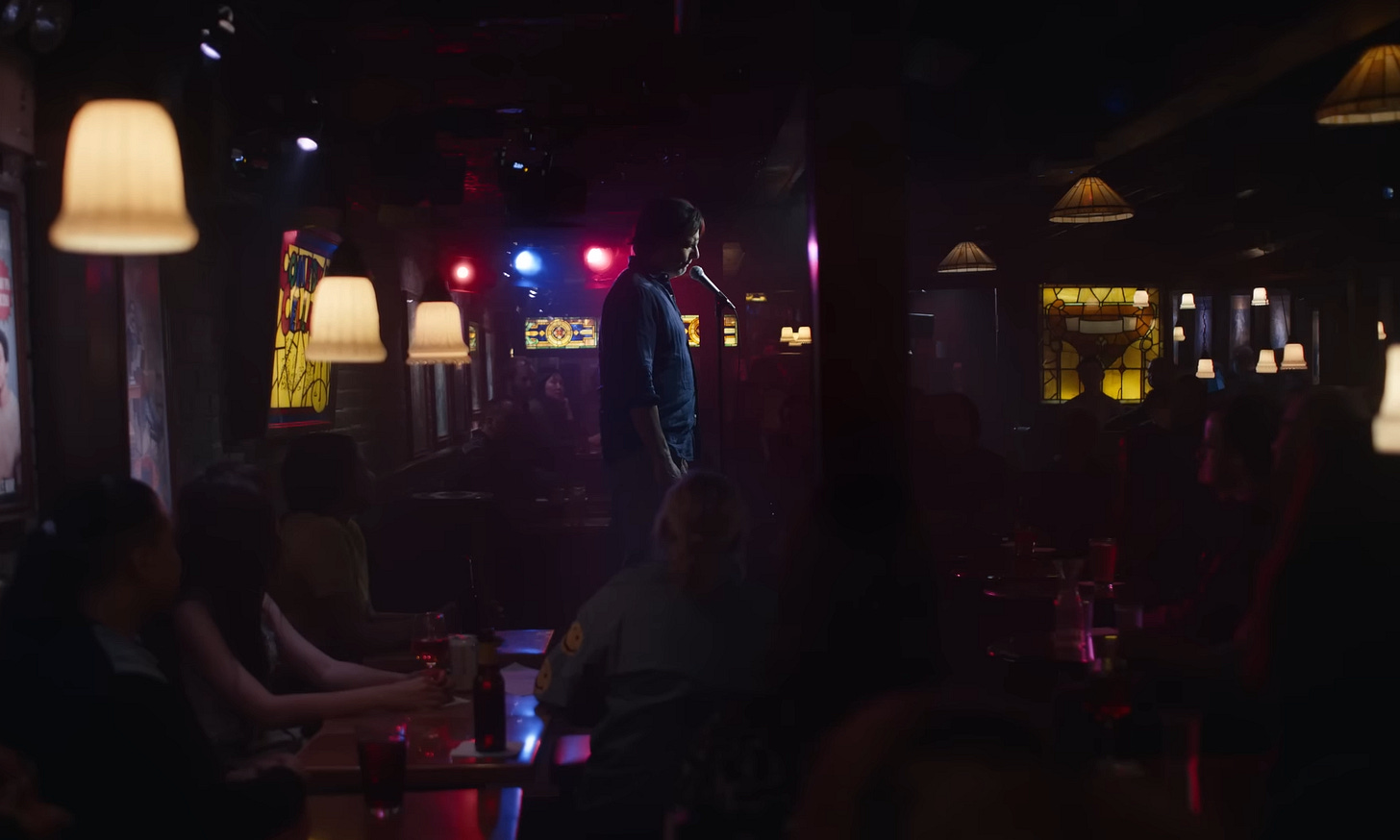 In the film’s first official teaser trailer, Alex walks into a dimly lit neighborhood bar (looks like they shot inside New York’s famous Comedy Cellar), downs a drink at the counter, and is then guided toward the basement stage where his real test awaits.