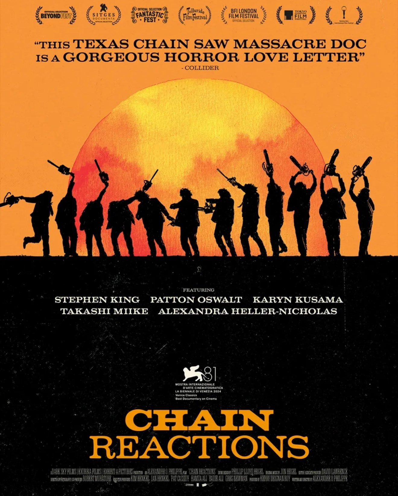 Featuring insights from horror legend Stephen King, comedian Patton Oswalt, filmmaker Karyn Kusama, Japanese auteur Takashi Miike, and horror critic Alexandra Heller-Nicholas, Chain Reactions shows how this low-budget nightmare became a global horror touchstone. Some films cut deep. But this one still slices through pop culture, nightmares, and generations of filmmakers.
